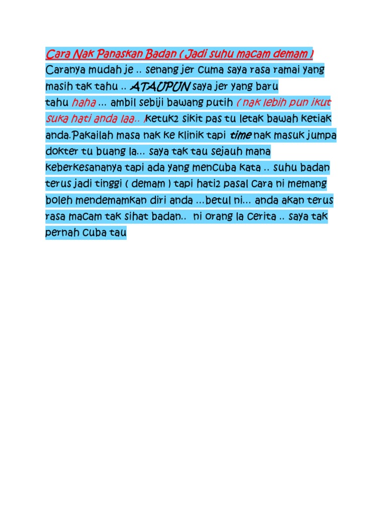 50 8 50 found this document useful 8 votes 58K views 1 page. CaRa NaK DeMaM Ok harini aq nak share tentang cara nak demam 1. Anda boleh mengambil suhu badan pada bayi yang demam dengan beberapa cara seperti melalui rektum mulut ketiak dan dahi.